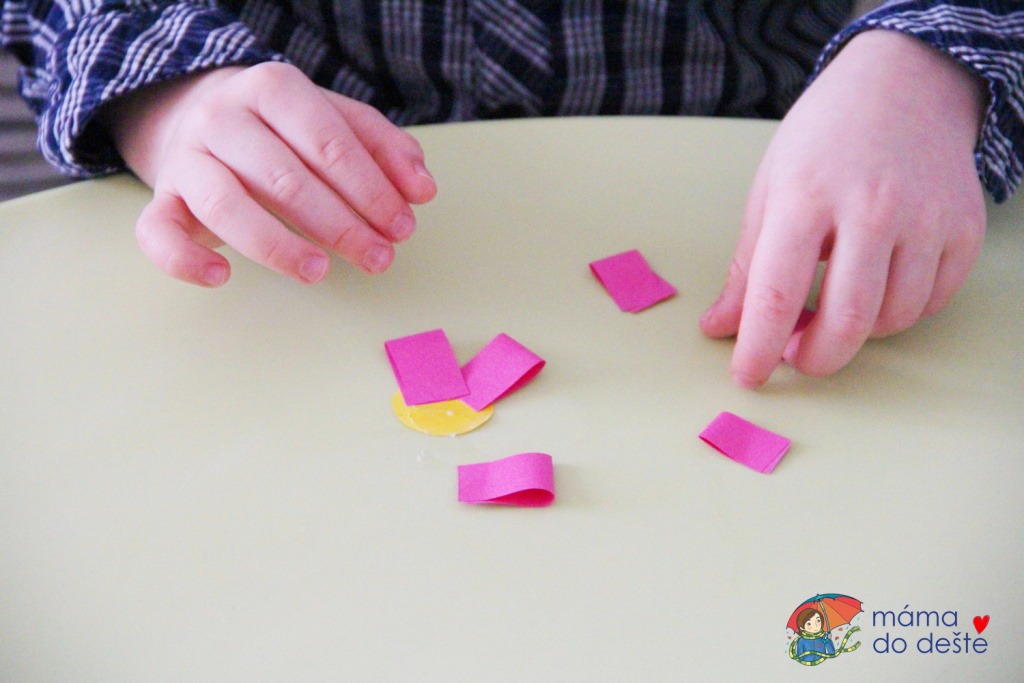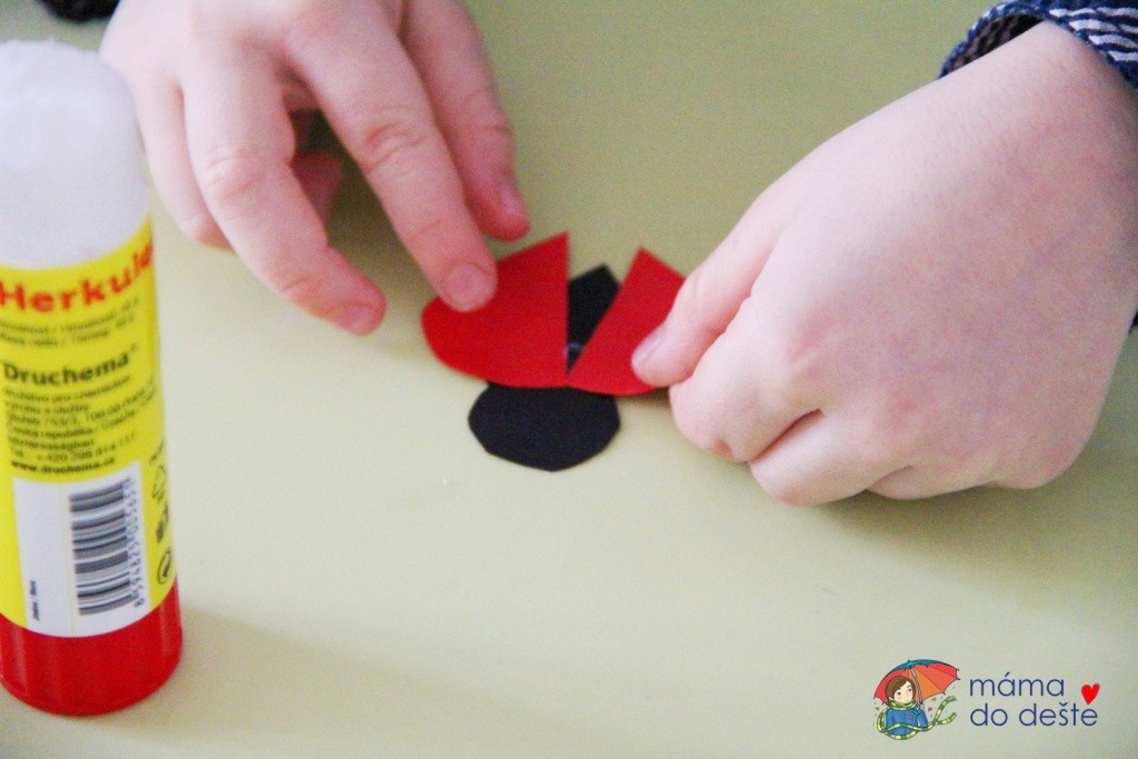 Z barevného papíru děti vyráběly kytičky a berušky. Na žlutý střed nalepily lístečky a poté kytičku připevnily na pevný karton. Na černé tělíčko nalepily krovky, na ně nakreslily černé tečky. Poté celou berušku nalepily na karton. Když lepidlo uschlo, přilepily jsme ozdoby na magnet.