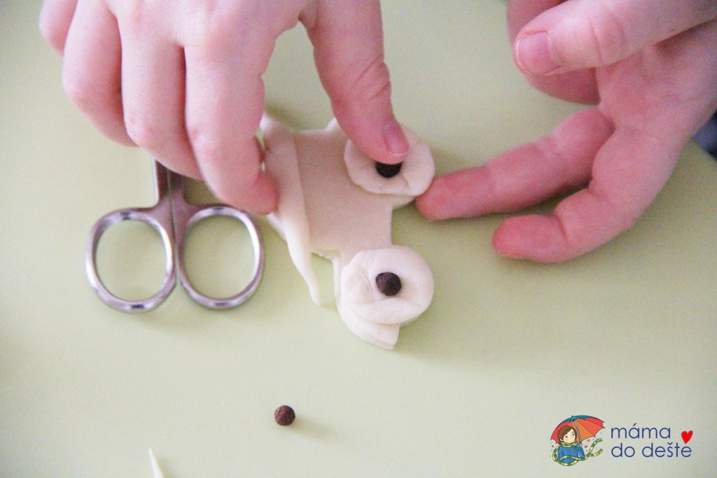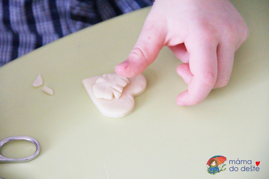 Z mouky a vody a octu jsem vyrobila vizovické těsto (postačí 125 g hladké mouky, lžička octa, 50 ml vlažné vody). Martínek z těsta vyrobil ozdobičky, které jsem dala upéct. (Podrobnější článek o vizovickém těstě zde.) Po vychladnutí jsem přilepila ozdoby chemoprenem k magnetické folii.