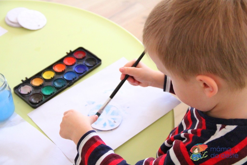 Vybarvovali jsme vodovkami, vyzkoušet můžete také tempery. Pokud budete kreslit temperami, je potřeba na kresbu voskovkou pořádně přitlačit, aby byla vidět. Ozdoby děti pokreslily z obou stran.