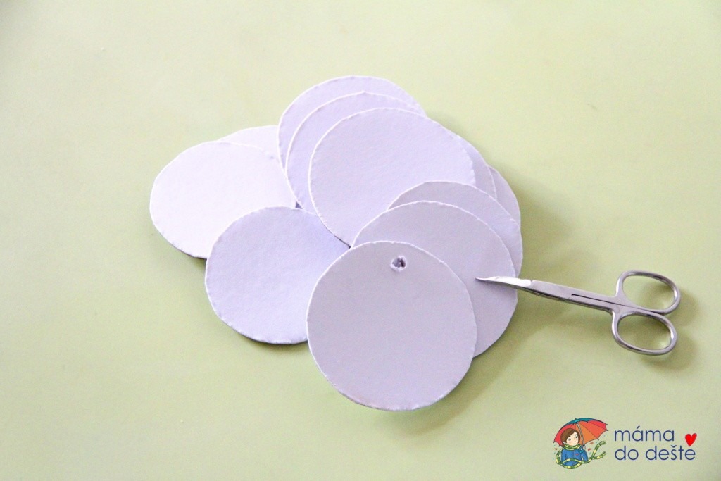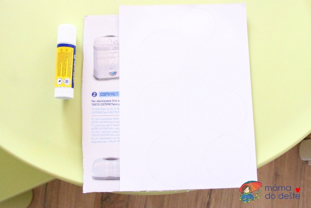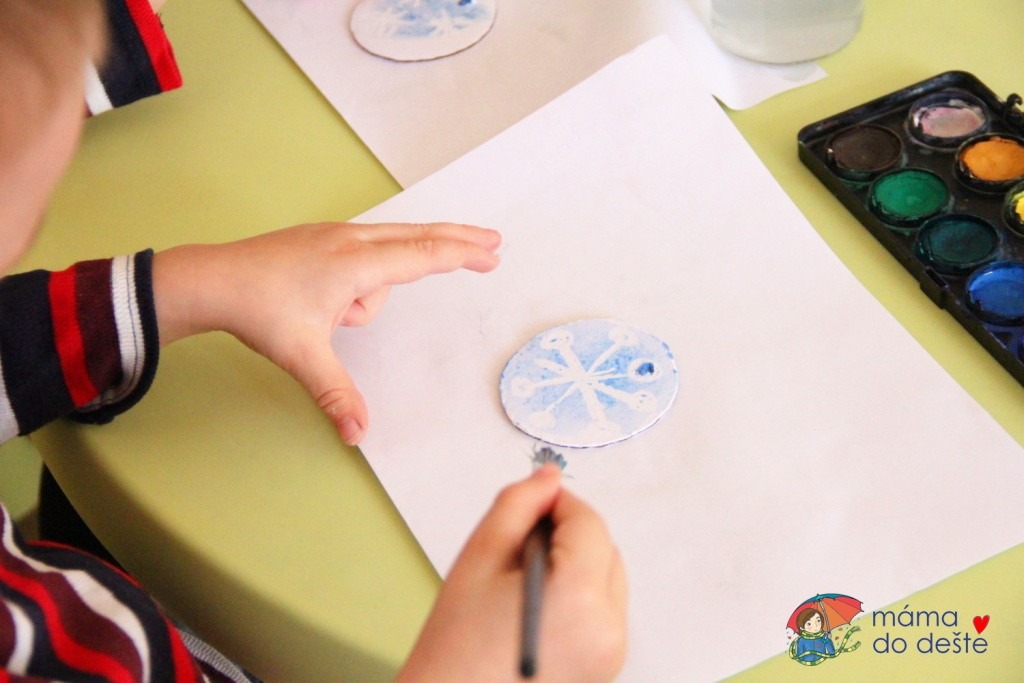 Nejprve jsem na kus kartonu z obou stran nalepila čtvrtku, poté jsem obkreslila kolečka (formičky), tvary jsem vystřihla a nůžkami proděravěla. Na kolečka jsem nakreslila bílou voskovkou hvězdičky a děti se pustily do vybarvování.