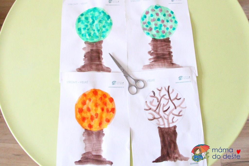 Když byly stromy vytištěny, vybarvili jsme každý stromek podle ročního období. Děti vytvořily jarní, letní, podzimní a zimní strom. Při kreslení záleží na tom, jak staré dítě strom vyrábí. Menší děti budou potřebovat poradit, školáci zvládnou kreslit sami.