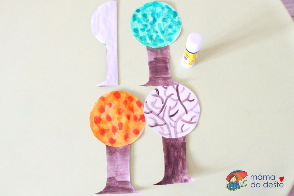 Nejprve jsem všechny vystřižené stromy přehnula podélně na polovinu. Poté jsem natřela jarní strom lepidlem. Přilepila jsem na něj přehnutý letní strom (pouze jednou polovinou). Následně jsem vyčnívající polovinu (tu druhou, nepřilepenou) natřela lepidlem a nalepila jsem na ni polovinu podzimního stromu. Nakonec jsem přilepila na polovinu podzimního a polovinu jarního stromu zimní strom. Zdá se to trošku zamotané, ale podle fotografií uvidíte, jak postupovat.