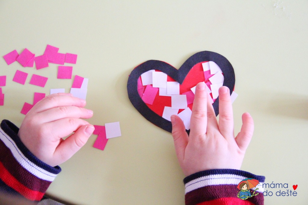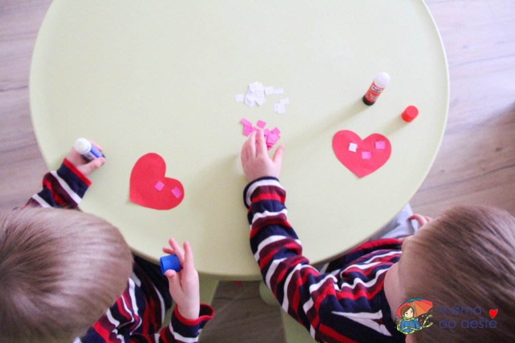Lepení je vhodné i pro děti, které s ním začínají. Filka v necelých dvou a půl letech trpělivě nanášel kostičky na barevný podklad. Lepení ho moc bavilo, z výsledku měl radost. Martínek zvládl ozdobit srdíčko ve třech a tři čtvrtě letech s přehledem.