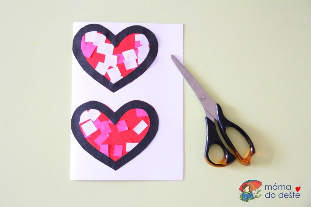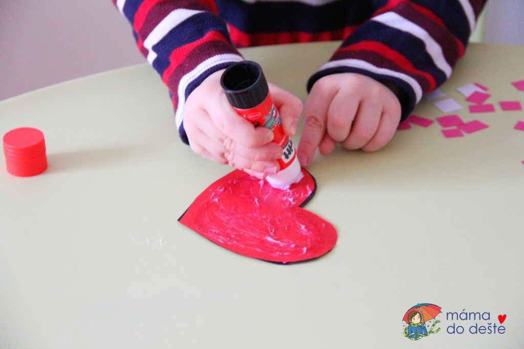 Z červeného papíru jsem vystřihla dvě srdce. Z bílého a růžového papíru jsem vystřihla malé čtverečky. Děti natřely srdce lepidlem, opatrně a pomalu na ně kladly podle své fantazie čtverečky. Když bylo srdíčko ozdobeno, nalepili jsme na něj černý rámeček. Martínek jej přilepil s mírnou pomocí sám, Filka rámeček roztrhl a musela jsem mu s lepením pomoci.